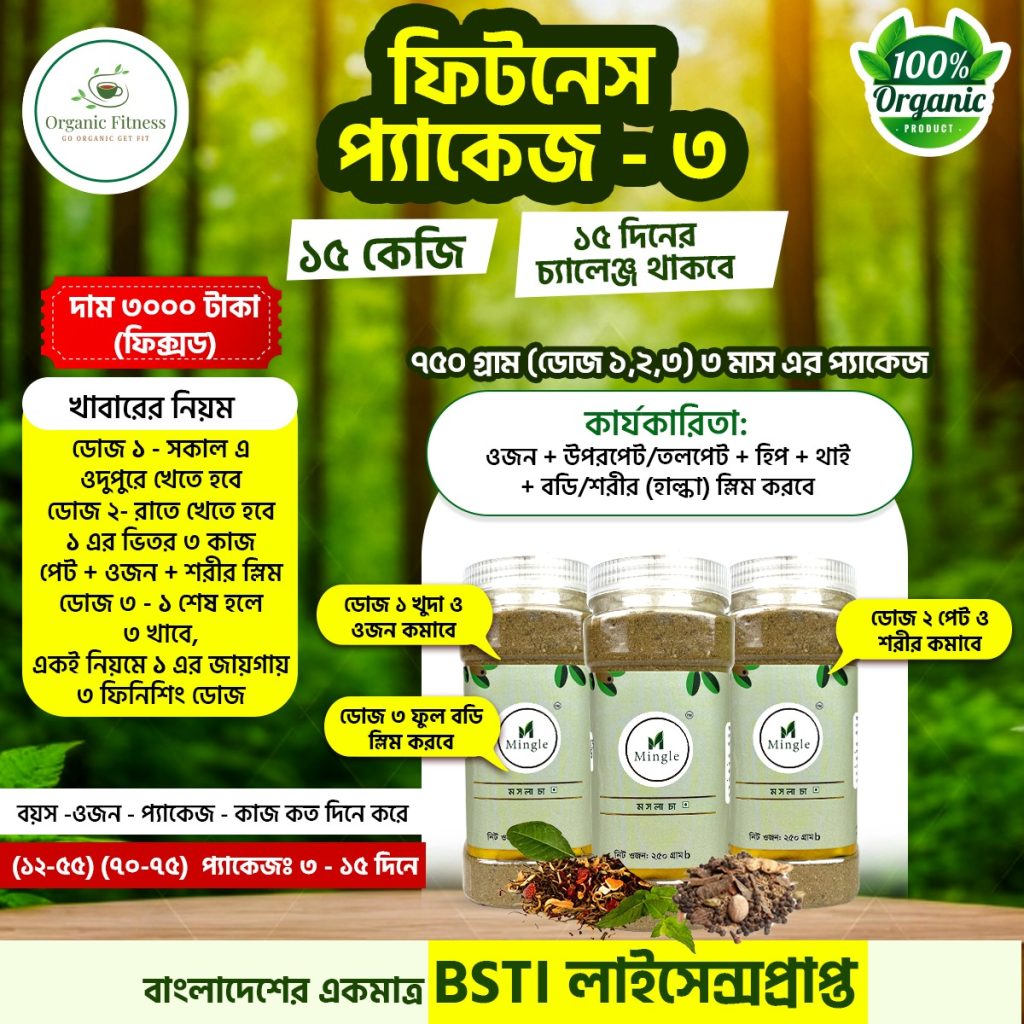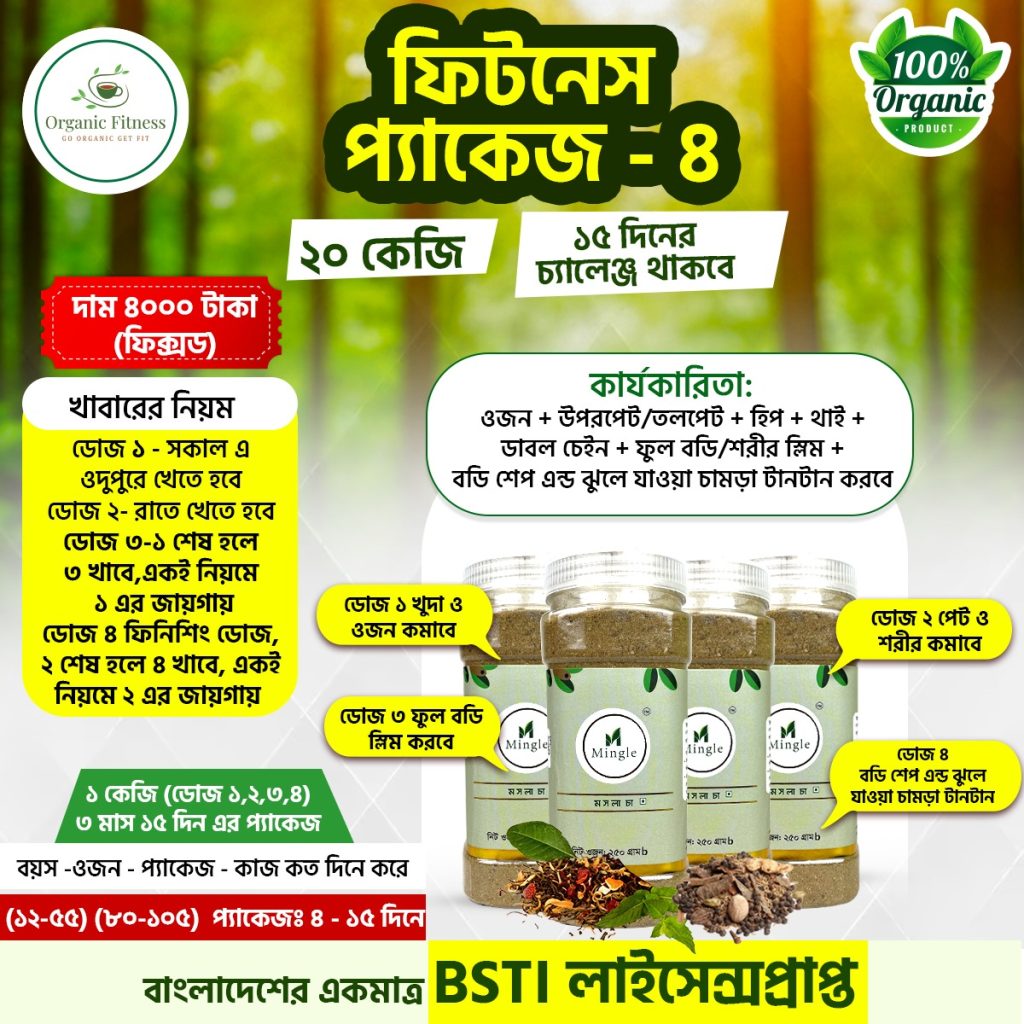 একটি ২৫০ ml মিঙ্গেল মসলা টি এর দাম ১২০০ টাকা এবং এইগুলা যার যার বয়স ও ওজন এর উপর নির্ভর করে তৈরী করা তাই আপনি আপনার বয়স ও ওজন অনুপাত এ প্যাকেজ নিন ১৫ দিনে রেজাল্ট পেয়ে যাবেন নিয়ম করে খেলে এটা পরীক্ষিত এন্ড প্রমাণিত ।